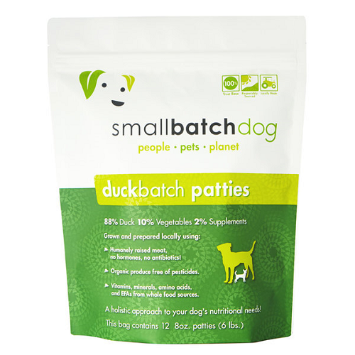 88% humanely raised and harvested duck, 10% organic produce, 2% natural supplementsduck including bones, duck gizzards, duck hearts, duck livers, organic squash, organic celery, organic cauliflower, organic green beans, salmon oil, organic bok choy, organic apple cider vinegar, organic kelp*, organic dandelion, organic cilantro, organic bee pollen, organic wheat grass, organic bilberry, organic garlic, organic thyme, organic oregano, vitamin e supplement