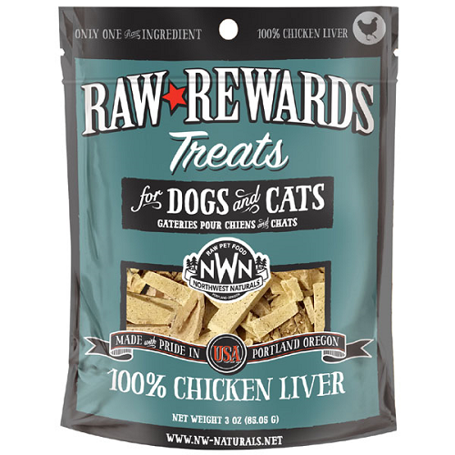Northwest Naturals Raw Rewards Freeze Dried Chicken Liver Cat and Dog Treats are wholesome, healthy, single ingredient treats naturally rich in protein and essential nutrients. Sourced and made in USA.