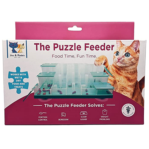 Veterinarian designed to help improve scarf and barf, reduce boredom, and allow portion controlFulfills your pets natural sense to hunt and play with food, reduces stress and bad behaviorMultiple degrees of challenges for your cat with 9 compartments with open tops & 6 compartments with flip-top lids-top lidsSuction cups on base help to secure feederFor an added challenge, consumer can adhere suction cups to a wallFood time is FUN TIME with Doc & Phoebe's The Puzzle Feeder. Our challenging feeder offers cats a way to fulfill the instinct of hunting, foraging and playing with their food.Place a small amount of food or treats into the puzzle and provide varying challenges by closing the flaps