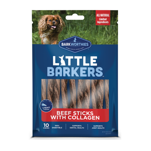 Our Beef Sticks with Collagen are an all natural chew that promotes dental health, mobility, healthy skin and coat. This light chew packs a lot in a 6" stick for your Little Barker to easily enjoy.