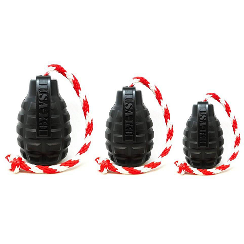 REWARD TOY: With a durable rope attached, the grenade becomes an ideal reward toy/prey toy/tug toy for your working K9.DURABLE CHEW TOY: The Magnum Grenade Toy is designed to withstand the abuse of powerful chewers. Our black Magnum compound has a special additive to increase tear strength. Chewing on this toy will help keep your dog's teeth clean and breath fresh.DISPENSES TREATS: Help your dog fight boredom by filling the Grenade Toy with treats like kibble, canned dog food, peanut butter, or your favorite dog treat recipe. Best results: mix wet/dry foods. Freeze with treats inside to prolong use.REDUCES PROBLEM BEHAVIORS: Reduces problem chewing, helps reduce boredom, and relieves separation anxiety.MADE IN USA: Proudly keeping jobs in America! Designed and manufactured in the USA!ANIMAL & PLANET FRIENDLY: Material is FDA compliant, non-toxic and biodegradable. Sustainably harvested helping us reduce our carbon footprint. VETERINARIAN APPROVED: Veterinarian Approved!EXTRA LARGE: 5.4” tall, 3.5” wide. Weight: 14.1 oz. For dogs 60-90 lbs/25-40 kg.LARGE: 4.6” tall, 3” wide. Weight: 9 oz. For dogs 30-60 lbs/15-27 kg.