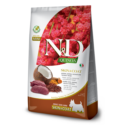 N&D Quinoa SKIN&COAT - Venison, quinoa, coconut and turmeric recipe for adult dogs is formulated to meet the nutritional levels established by the AAFCO Dog Food Nutrient Profiles for maintenance.