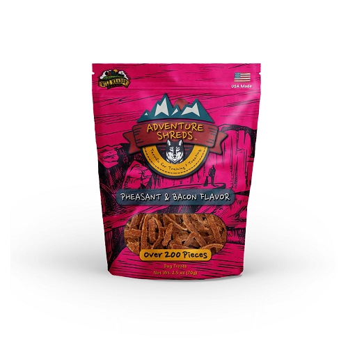 Our USA-made Pheasant Adventure Shreds combine the exciting taste of Pheasant and the enticing flavor of real bacon that every dog is sure to love. We craft the treats into a thin, ribbon shape that makes it easy to tear and portion. The bag is full with over 200 pieces or like we say "200 Reasons to Treat Your Dog." The shape and texture of these soft, flavorful treats make them ideal for those personal interactions with your dog, whether it's a training session or you want to treat them just because you love 'em.