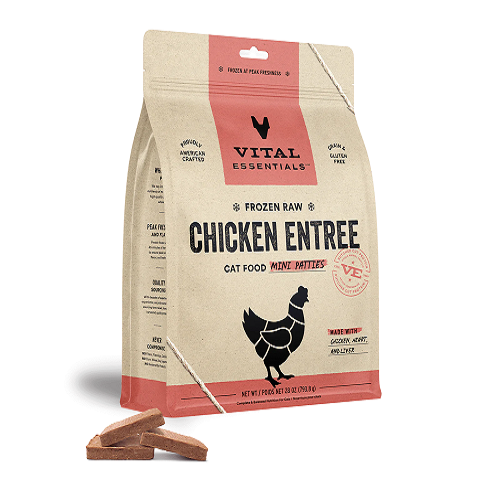 Vital Essentials: FELINE FROZEN Raw Chicken Mini Patties (new)When it comes to feeding your cat a raw diet, superior protein provides superior benefits. Packed with butcher cut protein, our limited ingredient frozen mini patties are the perfect solution to serving your cat a raw diet containing the naturally occurring vitamins and minerals that build strong muscles for more play, naturally support digestive and oral health, and provide essential nutrients to look and feel their best. Simply thaw and serve no mixing or cooking required.