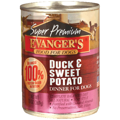 Evanger's Gold Duck and Sweet Potato Canned Dog Food - 13 ozEvanger's complete dog dinners are naturally the best, made with no perservatives. Duck meats and golden sweet potatoes are a gourmet dinner and a wonderful source of fiber.Ingredients: Duck, Chicken Broth, Sweet Potatoes, Liver, Guar Gum, Vitamins {Vitamin E Supplement, Niacin Supplement, L-Ascorbyl-2-Polyphosphate (Source of Vitamin C), Thiamine Mononitrate (Source of Vitamin B1), Calcium Pantothenate, Vitamin A Supplement, Pyridoxine Hydrochloride (Source of Vitamin B6), Riboflavin Supplement (Source of Vitamin B2), Folic Acid, Vitamin B12 Supplement, Biotin, Vitamin D2 Supplement}, Minerals {Zinc Sulfate, Iron Sulfate, Copper Sulfate, Manganese Sulfate, Selenium Yeast, Potassium Iodide}.Guaranteed Analysis: Crude Protein Min. 9.0%, Crude Fat Min. 4.0%, Crude Fiber Max. 1.5%, Moisture Max. 78.0%Calories: 188 Kcals/100G, 694 Kcals/Can
