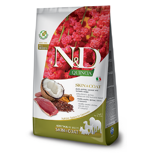 N&D Quinoa SKIN&COAT - Duck, quinoa, coconut and turmeric recipe for adult dogs is formulated to meet the nutritional levels established by the AAFCO Dog Food Nutrient Profiles for maintenance.