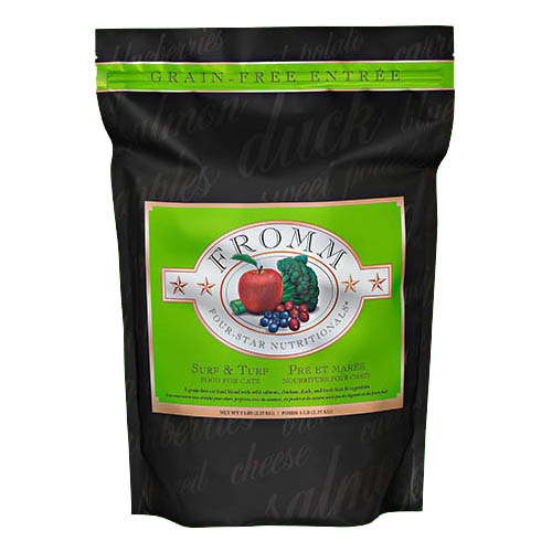 Fromm Surf and Turf Cat Food - (Grain Free)A grain-free blend of fresh Wisconsin duck, wild salmon, chicken, hand-picked vegetables & fruit, eggs, and real Wisconsin cheese prepared with the proper balance of protein and fat avoiding excessive levels of protein and ash.
