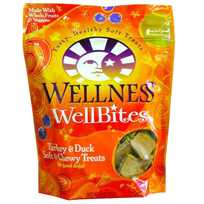 Wellness Wellbites - Turkey & DuckWe know you want to show your dog extra love with a treat that is as healthy and wholesome as it is delicious. WellBites combine a unique blend of healthy ingredients like lamb, salmon, sweet potatoes, apples, blueberries and flaxseed into a soft, tasty and nutritious treat. These real food bites are a great size for training, treating, or just plain spoiling!Product Highlights: