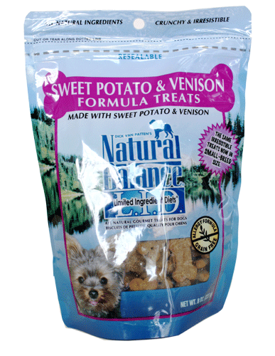 Natural Balance Sweet Potato & Venison Treats Small Breed Size Small-Breed Sized Treats in 8 oz. Bags!Natural Balance® Sweet Potato & Venison Formula Treats are special Allergy Formula Treats, made specifically for dogs prone to allergies, and a perfect complement to Natural Balance® Sweet Potato & Venison Food. Natural Balance® Sweet Potato & Venison Treats are a proven formula for dogs with allergies based on our unique protein and carbohydrate blend.Some dogs may be highly sensitive to commonly used proteins, carbohydrates and food additives in their diet. Allergic reactions can lead to irritable bowel, upset stomach, and a number of skin problems. Natural Balance® has created our new Sweet Potato & Venison Formula Diet for dogs, which combines venison, a source of animal protein that most dogs have not been exposed to, and fresh sweet potatoes, a source of carbohydrate not commonly found in dog foods.Great for training or as a healthy treat.No Artificial Preservatives, Flavors or Colors.