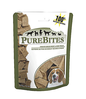 PureBites Freeze Dried Beef Liver Dogs and cats love the taste of purebites! Only one ingredient. 100% natural and pure USDA inspected Beef Liver.High in protein and less than 10 calories per treatFreeze dried to lock in valuable nutrients and freshnessIngredient: Beef LiverGuaranteed Analysis: Crude protein 65% min, Crude fat 5% min, Crude fiber 1% max, Moisture 4% max Available in:.60 oz (Cat Packaging)2.0 oz 4.2 oz bag8.8 oz