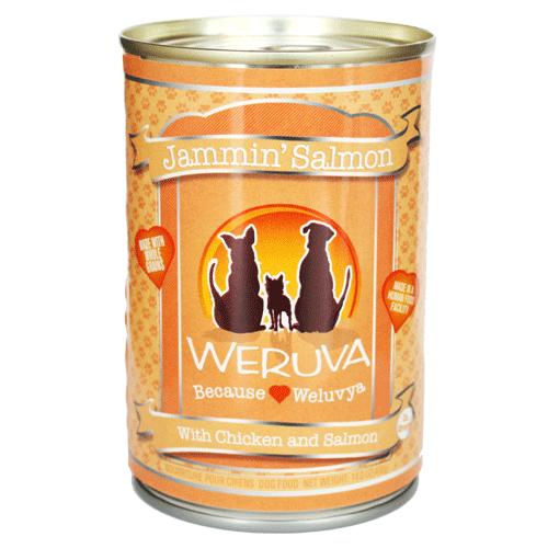 Weruva Jammin Salmon Canned Dog FoodWe jammin’ to the tune of boneless, skinless, white breast chicken and wild caught salmon, loaded with Omega-3s for healthy skin and coat. Made with tomatoes, green peas and sweet potato in a pumpkin soup—made without added antibiotics or hormones... they’ll be jammin’ all day with a satisfied belly!Ingredients: Chicken (Boneless, Skinless, White Breast Meat), Water Sufficient for processing, Pumpkin, Salmon, Tomatoes, Green Peas, Sweet Potato, Potato Starch, Sunflower Seed Oil, Dicalcium Phosphate, Xanthan Gum, Choline Chloride, Vitamin E Supplement, Zinc Sulfate, Thiamine Mononitrate (Vitamin B1), Nicotinic Acid, Ferrous Sulfate, Calcium Pantothenate, Vitamin A Supplement, Potassium Iodide, Manganese Sulfate, Vitamin D3 Supplement, Copper Sulfate, Riboflavin Supplement (Vitamin B2), Pyridoxine Hydrochloride (Vitamin B6), Folic Acid, Vitamin B12 Supplement.Guaranteed Analysis: Protein (min) 8%, Fat (min) 1.4%, Fiber (max) 0.5%, Moisture (max) 86%, Ash (max) 1.2%Calories: 14oz Can 300