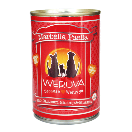 Weruva Marbella Paella Canned Dog FoodFor the seafood lovers, if you can't bring your dog to Spain . . . bring Spain to your dog! Let them enjoy a paella mix of mackerel flakes, whole calamari, baby shrimp and mussels, rich in omega-3's . . . everything but the kitchen sink! Fabulosa!Ingredients: Mackerel Flakes, Calamari, Shrimp, Mussel, Water Sufficient for processing, Rice, Vegetable Gums (Locust Bean, Guar, Carrageenan), Sunflower Seed Oil, Dicalcium Phosphate, Choline Chloride, Taurine, Vitamin E Supplement, Zinc Sulfate Heptahydrate, Canthaxanthin, Ferrous Sulfate Monohydrate, Nicotinic Acid (Vitamin B3), Thiamine Mononitrate (Vitamin B1), Calcium Pantothenate, Manganese Sulfate Monohydrate, Potassium Iodide, Vitamin A Supplement, Copper Sulfate Pentahydrate, Vitamin D Supplement, Riboflavin Supplement (Vitamin B2), Pyridoxine Hydrochloride (Vitamin B6), Folic Acid, Menadione Sodium Bisulfate Complex (Source of Vitamin K), Vitamin B12 Supplement.Guaranteed Analysis: Protein (min) 12%, Fat (min) 1.6%, Fiber (max) 0.5%, Moisture (max) 83%, Ash (max) 2.0%