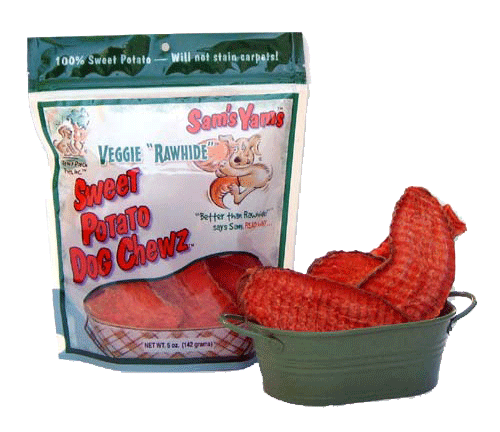 Sam's Yams Veggie RawhideAn excellent chew for all dog sizes. Made of whole thick slabs of USA grown sweet potatoes, then dehydrated through our unique process. The chews have a hard surface, excellent for dental health, and a chew ability that dogs love. Also since it is made of sweet potatoes compared to rawhide it is digestible for your dog's stomach. Smaller breeds will chew these for fifteen to twenty five minutes. Medium to larger sized dogs will chew them faster, of course. All Sam's Yams Dog Chews are particularly well suited for senior dogs whose teeth and gums are more sensitive.Ingredients: Sweet Potatoes