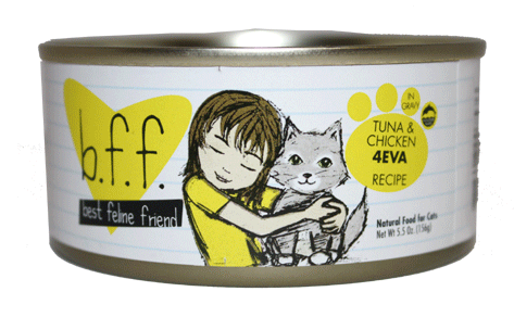 BFF Tuna and Chicken 4EVA Cat RecipeBFF Cat Food Recipes are formulated to meet nutritional levels established by the AAFCO Nutrient Profiles for Adult Maintenance. Feed according to the age, size and activity of your cat. If fed alone, feed 1.0 oz for each pound of bodyweight daily, best fed twice a day. Your cat should have access to clean, fresh water. Refrigerate after opening.Ingredients: Tuna, Water Sufficient for processing, Chicken, Potato Starch, Sunflower Seed Oil, Tricalcium Phosphate, Xanthan Gum, Choline Chloride, Taurine, Vitamin E Supplement, Zinc Sulfate, Thiamine Mononitrate (Vitamin B1), Nicotinic Acid (Vitamin B3), Ferrous Sulfate, Calcium Pantothenate, Vitamin A Supplement, Potassium Iodide, Manganese Sulfate, Vitamin D3 Supplement, Copper Sulfate, Riboflavin Supplement (Vitamin B2), Pyridoxine Hydrochloride (Vitamin B6), Folic Acid, Menadione Sodium Bisulfate Complex (Source of Vitamin K), Vitamin B12 Supplement.