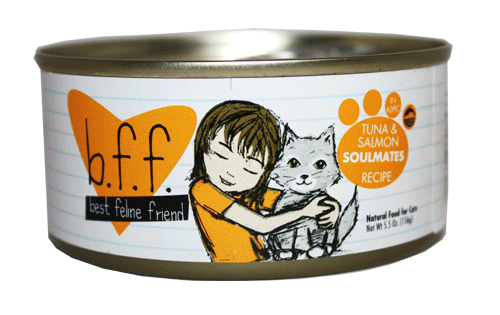 BFF Tuna and Salmon Soulmates Cat Recipe BFF Cat Food Recipes are formulated to meet nutritional levels established by the AAFCO Nutrient Profiles for Adult Maintenance. Feed according to the age, size and activity of your cat. If fed alone, feed 1.0 oz for each pound of bodyweight daily, best fed twice a day. Your cat should have access to clean, fresh water. Refrigerate after opening.Ingredients: Tuna, Water Sufficient for processing, Salmon, Sunflower Seed Oil, Locust Bean, Guar Gum, Carrageenan, Tricalcium Phosphate, Choline Chloride, Taurine, Vitamin E Supplement, Zinc Sulfate, Thiamine Mononitrate (Vitamin B1), Nicotinic Acid (Vitamin B3), Ferrous Sulfate, Calcium Pantothenate, Vitamin A Supplement, Potassium Iodide, Manganese Sulfate, Vitamin D3 Supplement, Copper Sulfate, Riboflavin Supplement (Vitamin B2), Pyridoxine Hydrochloride (Vitamin B6), Folic Acid, Menadione Sodium Bisulfate Complex (Source of Vitamin K), Vitamin B12 Supplement.