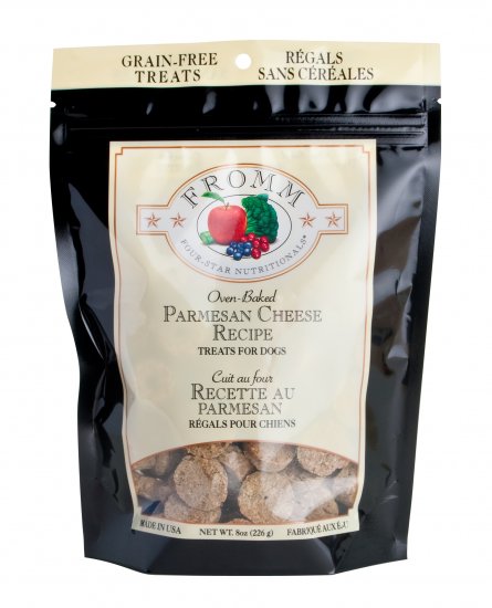 Fromm (Grain Free) Parmesan Cheese Recipe TreatsA grain-free gourmet treat, oven baked with fresh Wisconsin parmesan cheese, vegetables, and a touch of oregano.Fromm Family Foods has been family owned and operated in Wisconsin since 1904 and is dedicated to assuring unprecedented quality and safety in all its pet food products. The Fromm Family has over a 100 year history in animal nutrition and promises to continue to deliver the finest in dry, canned and treat products for pets.Ingredients: Parmesan Cheese, Pea Flour, Potato Flour, Tapioca, Whole Peas, Chicken Fat (Preserved with Mixed Tocopherols), Tomato Pomace, Cranberries, Sweet Potatoes, Carrots, Apples, Split Peas, Green Beans, Green Bell Peppers, Celery, Beets, Oregano, Parsley, Lettuce, Watercress, SpinachGuaranteed Analysis: Protein (min) 12%, Fat (min) 5%, Crude Fiber (max) 5%, Moisture (max) 12%Size: 8 oz