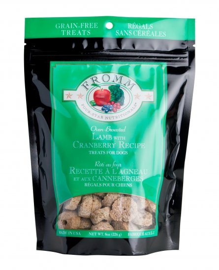 Fromm (Grain Free) Salmon with Sweet Potato RecipeA savory grain-free treat made with fresh lamb, cranberries, apples, vegetables, and parsley.Fromm Family Foods has been family owned and operated in Wisconsin since 1904 and is dedicated to assuring unprecedented quality and safety in all its pet food products. The Fromm Family has over a 100 year history in animal nutrition and promises to continue to deliver the finest in dry, canned and treat products for pets.Ingredients: Lamb, Pea Flour, Potato Flour, Tapioca, Whole Peas, Chicken Fat (Preserved with Mixed Tocopherols), Tomato Pomace, Cranberries, Sweet Potatoes, Carrots, Apples, Split Peas, Green Beans, Green Bell Peppers, Celery, Beets, Parsley, Lettuce, Watercress, SpinachGuaranteed Analysis: Protein (min) 12%, Fat (min) 5%, Crude Fiber (max) 5%, Moisture (max) 12%Size: 8 oz