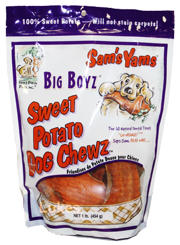Sam's Yams Veggie Rawhide 1 Lb.Made of very thick slabs of sweet potato, dehydrated. Designed for larger breeds, but smaller dogs will enjoy them as well and they will last them a good long time. Each slice is perforated in order to assist in the dehydration of such a large piece. The surface is hard so as to provide dental benefits, yet the chews have a texture similar to rawhide. Each chew has the nutritional value of half of a large sweet potato.All Sam's Yams Dog Chews are particularly well suited for senior dogs whose teeth and gums are more sensitive.Ingredients: Sweet Potatoes