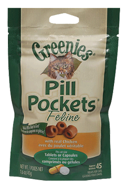 Greenies Pill Pockets Feline ChickenWhy Greenies Pill Pockets Treats?Getting your pet to take a pill or medication can be diffcult and can leave you feeling frustrated and your pet angry, scared or confused.Greenies Pill Pockets Treats - Offer a proven solution to your pill-giving problem- Contain a built-in pouch suited for hiding a pill- Make taking pills a positive experience for your pet