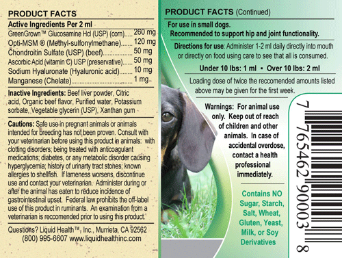 Chondroitin Sulfate USP: Not all chondroitin supplements are of equal quality. Liquid Health uses the same USP grade chondroitin used in its human formulas. Studies have shown that high quality chondroitin has synergistic effects in joint health when used with glucosamine.