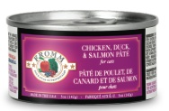 Fromm Chicken, Duck, & Salmon Pate Canned Cat Food 5 oz - Grain FreeHuman-grade, finely minced chicken, duck and wild salmon in chicken broth. Fromm Four-Star Chicken, Duck & Salmon Pate Canned Entrée brings ultra premium, natural cat food to a new level.Ingredients: Chicken, Chicken Broth, Duck, Salmon, Ocean Fish, Chicken Liver, Pea Fiber, Tomato Paste, Potato Starch, Calcium Sulfate, Taurine, Choline Chloride, Salt, Potassium Chloride, Vitamin E Supplement, Iron Chelate, Zinc Chelate, Niacin Supplement, Vitamin A Supplement, Calcium Pantothenate, Potassium Iodate, Riboflavin Supplement, Manganese Supplement, Pyridoxine Hydrochloride, Vitamin D3 Supplement, Sodium Selenite, Thiamine Mononitrate, Copper Chelate, Vitamin B12 Supplement, Folic Acid, Biotin.Guaranteed Analysis: Protein (min) 8%, Fat (min) 2%, Fiber (max) 1.5%, Moisture (max) 80%, Ash (max) 1.9%, Magnesium (max) 0.025%, Taurine (min) .1%