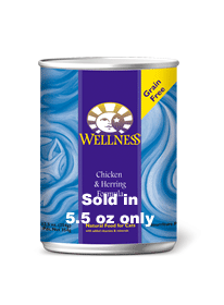 Wellness Chicken and Herring Canned Cat FoodWellness® Canned Chicken & Herring Recipe provides two sources of high quality protein and essential fatty acids, made with chicken and fish free of added growth hormones and steroids. We use herring as a source of protein and long chain Omega 3 fatty acids which are critical for healthy skin and coat, proper body function and enhanced learning. High quality chicken provides a delicious, digestible protein source. This recipe also includes delicious sweet potatoes and carrots as an excellent source of vitamins, minerals and beta-carotene. Fresh, whole cranberries and blueberries are added to help maintain proper urinary tract health.
