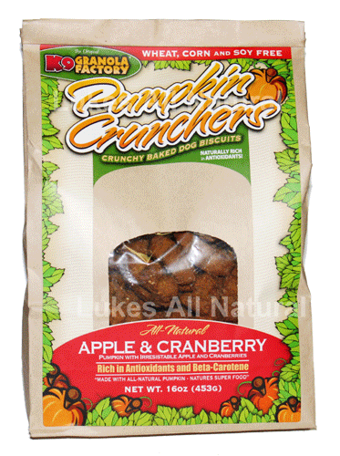 K9 Granola Factory Pumpkin Crunchers Apple and CranberryPumpkin Crunchers are an all natural wheat free cookie. Pumpkin is very high in carotenoids. They are what give pumpkins their bright orange color. Pumpkins also contain several beneficial nutrients such as zinc, iron and fiber. Dogs love the taste of the pumpkin and when combined with the tartness of fresh delicious cranberries and the sweetness of juicy sun-ripened appl, you've got a treat sure to get tails wagging.Ingredients: Pumpkin, Oatmeal, Barley Flour, Oat Flour, Apples, Cranberries, Potato Flour, Vegetable Oil, Cane Molasses, Cinnamon, VanillaGuaranteed Analysis: Crude Protein (min) 10%, Crude Fat (min) 8%, Crude Fiber (max) 2%, Moisture (max) 8.5%