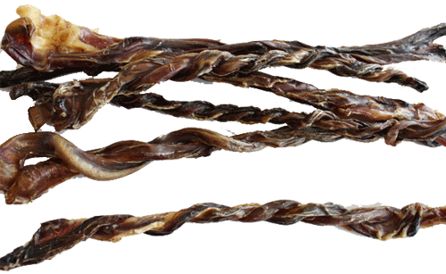 Pork Pizzle TwistThis is a great treat for small to medium sized dogs but would be a quick chew for a bigger dog. They are about 9 to 12 inches long.
