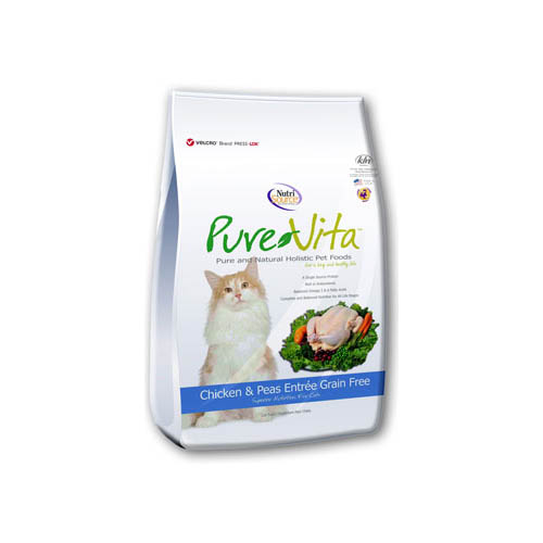 Pure Vita Grain Free Chicken Dry Cat FoodThe makers of NutriSource® proudly bring you PureVita Brand Pet Foods. PureVita's select pet formulas are carefully prepared using only the purest, all natural, holistic ingredients to support your pet's overall physical and emotional well-being and to maintain health and longevity. The essence of PureVita utilizes highly palatable, single source proteins and a variety of wholesome fruits and vegetables, each chosen for it's unique nutritional values and powerful phyto nutrient content. PureVitaTM also features Acai berries and pomegranate popularly known for their rich antioxidant benefits. PureVita is "pure life" and will support your loving pet's health and well being the same way your pet enhances your everyday life.Ingredients: Chicken, Chicken Meal, Peas, Pea Flour, Chicken Fat (preserved with mixed tocopherols and citric acid), Natural Flavors, Dried Egg Product, pea starch, Yeast Extract, Pea Fiber, Brewers Yeast, Tomato Pomace, Potassium Chloride, Salt, Phosphoric Acid, DL Methionine, Carrots, Sunflower Oil, minerals (Iron Proteinate, Zinc Proteinate, Copper Proteinate, Manganese Proteinate, Cobalt Proteinate), Cranberries, Apricots, Cherries, Yeast Culture (saccharomyces cerevisiae, Enterococcus Faecium, Lactobacillus Acidophilus, aspergillus niger, bacillus subtillis), Taurine, Tumeric, Dried Chicory Root, vitamins (Vitamin A Acetate, Vitamin D3 Supplement, Vitamin E Supplement, Niacin, d-Calcium Pantothenate, Thiamine Mononitrate, Riboflavin Supplement, Pyridoxine Hydrochloride, Folic Acid, Biotin, Vitamin B12 Supplement), Ascorbic Acid (vitamin C), Choline Chloride, Inositol, Yucca Schidigera Extract, glutamic acid, Rosemary Extract.Pure Vita Cat Grain Free Food is formulated to meet the nutritional levels established by the Association of American Feed Control Officials (AAFCO) Cat Food Nutrient Profiles for all life stages. Guaranteed Analysis:Crude Protein (Min.) 32.0% Crude Fat (Min.) 18.0%Crude Fiber (Max.) 6.5% Moisture (Max.) 10.0% Linolenic Acid (Min.) 3.0%Magnesium (Min.) .08%Zinc (Min.) 150 mg/kg 150 mg/kgCalorie Content - Metabolizable Energy (calculated): 3,600 kcals per kg, 400 kcals per cup