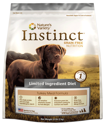 Nature's Variety Instinct Limited Ingredient - Turkey Dog FoodInstinct Grain Free Nutrition for Dogs - Limited Ingredient Diets:For pets with sensitive stomachs caused by food allergies or intolerances, less is more. Our new Instinct Limited Ingredient Diets are made with only pure, simple, essential ingredients that have been carefully chosen and thoughtfully balanced for your pet's special needs. Instinct Limited Ingredient Diets provide grain-free, gluten-free nutrition with one protein and one hypoallergenic starch, combined with just a few other wholesome, natural ingredients. Fewer ingredients means fewer worries that your pet will react negatively to his or her food. And with the variety of omega fatty acids in canola oil and coconut oil, your pet's skin and coat will be nourished naturally from the inside out. Now your pet can have the pure simple, instinctive nutrition he needs to enjoy life every day.
