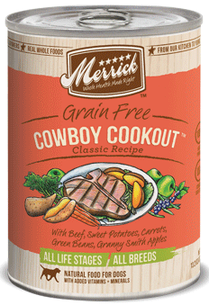 Cowboy Cookout™ is prepared with beef, sweet potatoes, carrots, green beans and Granny Smith apples. Merrick Classic Grain Free Cowboy Cookout™ Canned Dog Food contains no artificial colors, flavors or preservatives. It contains delicious home-style chunks that your dog will love.