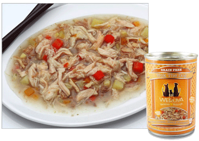 Weruva Wok The Dog Canned Dog Food (Grain Free) With Chicken, Beef and Pumpkin in GravyYour dog will be struttin’ its full belly after dining on this feast of boneless, skinless, white breast meat chicken mixed with shredded beef, pumpkin, carrot and sweet potato. Made with class and sass free of added antibiotics and hormones and also free range.Ingredients: Chicken (Boneless, Skinless, White Breast Meat), Beef, Water Sufficient for processing, Pumpkin, Carrot, Sweet Potato, Potato Starch,Sunflower Seed Oil, Dicalcium Phosphate, Xanthan Gum, Dried Spinach, Choline Chloride, Zinc Sulfate, Vitamin E Supplement, Thiamine Mononitrate (Vitamin B1), Nicotinic Acid, Ferrous Sulfate, Calcium Pantothenate, Vitamin A Supplement, Potassium Iodide, Manganese Sulfate, Vitamin D3 Supplement, Copper Sulfate, Riboflavin Supplement (Vitamin B2), Pyridoxine Hydrochloride (Vitamin B6), Folic Acid, Vitamin B12 Supplement.Guaranteed Analysis: Moisture (max) 85%, Crude Protein (min) 8%, Crude Fat (min) 1.4%, Ash (max) 1.2%, Crude Fiber (max) 0.5% Calories: 5.5oz Can 120, 14oz Can 300