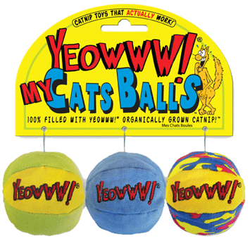 Yeowww! My Cats Balls 100% Filled with Yeowww! Organically grown Catnip!Three Yeowww! organic catnip filled balls on one header card are sure to be a hit. My Cats Balls will send kitty to new heights of pleasure the minute they start to fondle them. Each ball is 2” in diameter and full of nip.
