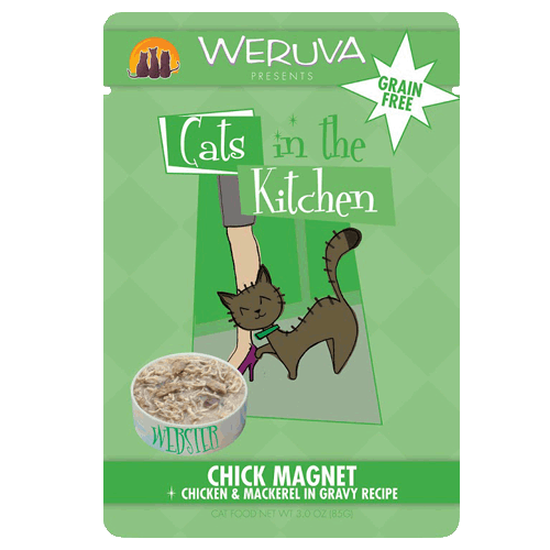 Weruva Chick Magnet - Chicken & Mackerel in Gravy Recipe 3oz pouchThe kitchen is so often the heart of the home. It is where our family gathers for meals, where we have our game night, where family bonds grow.We eat there, we laugh there—we feed our pets there. The inspiration for these delectable selections come from feeding our precious Cats in the Kitchen. Bring your cats to the heart of your home and share with us these savory cuts of white breast meat chicken and duck breast . . . delicate gravies, some with pumpkin for healthy digestion . . . loins from tuna, salmon and mackerel . . . and lean cuts of beef —all fit for our kitchen carnivores. These recipes are among our most delicious offerings. We hope your kitties love Cats in the Kitchen as much as the WeRuVa cats do—Webster, Rudi & Vanessa approved!Ingredients: Water Sufficient for processing, Chicken, Mackerel, Tapioca Starch, Sunflower Seed Oil, Tricalcium Phosphate, Xanthan Gum, Choline Chloride, Taurine, Zinc Sulfate, Vitamin E Supplement, Ferrous Sulfate, Thiamine Mononitrate(Vitamin B1), Nicotinic Acid (Vitamin B3), Calcium Pantothenate, Vitamin A Supplement, Potassium Iodide, Manganese Sulfate, Vitamin D3 Supplement, Copper Sulfate, Riboflavin Supplement (Vitamin B2), Pyridoxine Hydrochloride(Vitamin B6), Folic Acid, Vitamin B12 SupplementGuaranteed Analysis: Crude Protein (min) 9%, Crude Fat (min) 1.4%, Crude Fiber (max) 0.5%, Moisture (max) 85%, Ash (max) 2.0%, Calcium (max) 0.25%, Phosphorus (max) 0.25%, Magnesium (max) 0.03%, Taurine (min) 0.05%