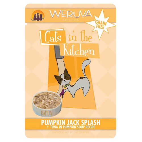 Weruva Pumpkin Jack Splash - Tuna in Pumpkin Soup Recipe 3 oz PouchThe kitchen is so often the heart of the home. It is where our family gathers for meals, where we have our game night, where family bonds grow.We eat there, we laugh there—we feed our pets there. The inspiration for these delectable selections come from feeding our precious Cats in the Kitchen. Bring your cats to the heart of your home and share with us these savory cuts of white breast meat chicken and duck breast . . . delicate gravies, some with pumpkin for healthy digestion . . . loins from tuna, salmon and mackerel . . . and lean cuts of beef —all fit for our kitchen carnivores. These recipes are among our most delicious offerings. We hope your kitties love Cats in the Kitchen as much as the WeRuVa cats do—Webster, Rudi & Vanessa approved!Ingredients: Water Sufficient for processing, Tuna, Pumpkin, Tapioca Starch, Sunflower Seed Oil, Tricalcium Phosphate, Xanthan Gum, Choline Chloride, Taurine, Zinc Sulfate, Vitamin E Supplement, Ferrous Sulfate, Thiamine Mononitrate(Vitamin B1), Nicotinic Acid (Vitamin B3), Calcium Pantothenate, Vitamin A Supplement, Potassium Iodide, Manganese Sulfate, Vitamin D3 Supplement, Copper Sulfate, Riboflavin Supplement (Vitamin B2), Pyridoxine Hydrochloride(Vitamin B6), Folic Acid, Vitamin B12 SupplementGuaranteed Analysis: Crude Protein (min) 9%, Crude Fat (min) 1.4%, Crude Fiber (max) 0.5%, Moisture (max) 85%, Ash (max) 2.0%, Calcium (max) 0.25%, Phosphorus (max) 0.25%, Magnesium (max) 0.03%, Taurine (min) 0.05%