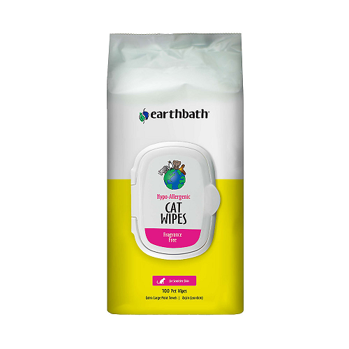 Earthbath Grooming WIPES: Hypo-Allergenic for Cats - 100 countUse these thick, large, moist wipes as a touch-up grooming solution or as a bath alternative. Earthbath grooming wipes handily clean pets' dirty paws, undercoat, (dirty bottoms too!), while imparting a show quality shine. Remove dander, drool, discharge and cling-ons from playing in the unknown. They contain only natural cleansers and conditioners, including exotic Hawaiian awapuhi extract, a shine-enhancing coat conditioner. These natural wipes contain no animal by-products (lanolin-free) or alcohol and will not remove spot-on flea control products. Both varieties contain Aloe Vera and Vitamin E to moisturize coat and skin. Notice how soft your hands are after wiping your pet... Safe for daily use on all animals over 6 weeks old.Hypo-AllergenicThese wipes are for our beloved furry friends who need a good cleansing, but may have sensitive skin, allergies, or who just don't want to smell like anything but themselves. Mild cleansers freshen and deodorize, while succulent leave-in conditioners impart a healthy shine and leave a supple coat. Your best friend will look and smell better than ever before!Comes in: 100 Extra thick 8" x 7" soft and moist pet wipes