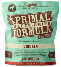 Primal Nuggets - Freeze Dried Dog Formula: ChickenPrimal Freeze-Dried Formulas are produced using only the freshest, human-grade ingredients. Our poultry, meat and game are antibiotic and steroid free without added hormones. We incorporate certified organic produce, certified organic minerals and unrefined vitamins to fortify our complete and balanced diets. All Primal Freeze-Dried Formulas contain fresh ground bone for calcium supplementation. This combination of ingredients offers optimum levels of the amino acids (protein), essential fatty acids, natural-occurring enzymes, and necessary vitamins and minerals that are the building blocks for your pet's healthy biological functions. All of the ingredients found in Primal Freeze-Dried Formulas are procured from ranches and farms throughout the United States and New Zealand that take pride in producing wholesome raw foods through natural, sustainable agriculture.Primal Freeze-Dried Formulas offer you the convenience and benefits of a well-balanced, safe and wholesome raw-food diet without having to grind, chop, measure or mix the ingredients yourself. At Primal Pet Foods, we have taken the time to carefully formulate and produce a nutritious, fresh-food diet that is easy for you to serve and delectable for pets to devour. The proof is watching them lick the bowl clean while thriving happily and healthfully!Ingredients: Chicken, Chicken Necks, Chicken Gizzards, Organic Kale, Organic Carrots, Organic Yams, Chicken Livers, Organic Broccoli, Organic Apples, Cranberries, Blueberries, Organic Pumpkin Seeds, Organic Sunflower Seeds, Organic Trace Minerals, Organic Parsley, Organic Apple Cider Vinegar, Salmon Oil, Organic Coconut Oil, Organic Quinoa Sprout Powder, Organic Kelp, Alfalfa, Mixed Tocopherols (source of vitamin E).Freeze-Dried Canine Chicken Formula Benefits: