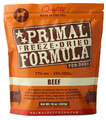 Primal Freeze Dried Formula for Dogs BeefPrimal Freeze-Dried Formulas are produced using only the freshest, human-grade ingredients. Our poultry, meat and game are antibiotic and steroid free without added hormones. We incorporate certified organic produce, certified organic minerals and unrefined vitamins to fortify our complete and balanced diets. All Primal Freeze-Dried Formulas contain fresh ground bone for calcium supplementation. This combination of ingredients offers optimum levels of the amino acids (protein), essential fatty acids, natural-occurring enzymes, and necessary vitamins and minerals that are the building blocks for your pet's healthy biological functions. All of the ingredients found in Primal Freeze-Dried Formulas are procured from ranches and farms throughout the United States and New Zealand that take pride in producing wholesome raw foods through natural, sustainable agriculture.Primal Freeze-Dried Formulas offer you the convenience and benefits of a well-balanced, safe and wholesome raw-food diet without having to grind, chop, measure or mix the ingredients yourself. At Primal Pet Foods, we have taken the time to carefully formulate and produce a nutritious, fresh-food diet that is easy for you to serve and delectable for pets to devour. The proof is watching them lick the bowl clean while thriving happily and healthfully!Ingredients: Beef Hearts, Beef Livers, Ground Beef Bones, Organic Kale, Organic Carrots, Organic Yams, Organic Broccoli, Organic Apples, Cranberries, Blueberries, Organic Pumpkin Seeds, Organic Sunflower Seeds, Organic Trace Minerals, Organic Parsley, Organic Apple Cider Vinegar, Salmon Oil, Organic Coconut Oil, Organic Quinoa Sprout Powder, Organic Kelp, Alfalfa, Mixed Tocopherols (source of vitamin E).Freeze-Dried Canine Beef Formula Benefits: