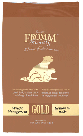Fromm Weight Management Dry Dog FoodA desirable approach to weight management. Made with a special blend of lean turkey liver, duck, chicken, lamb, whole eggs and real Wisconsin cheese, this lean 10% fat food helps control calorie intake without sacrificing other valuable nutrients, helping to manage weight and keep dogs healthy. In addition, we enhance our Gold recipes with probiotics to aid digestion and salmon oil for a healthy coat.