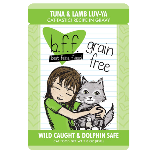 BFF Tuna and Lamb Luv Ya Cat Food 3 oz Pouch Cat FoodIngredients: Tuna Broth, Tuna, Lamb, Ground Tapioca, Sunflower Oil, Guar Gum, Calcium Sulfate, Tricalcium Phosphate, Vitamin E Supplement, Niacin Supplement, Thiamine Mononitrate (Vitamin B1), Vitamin A Supplement, Vitamin B12 Supplement, Calcium Pantothenate, Pyridoxine Hydrochloride (Vitamin B6), Riboflavin Supplement (Vitamin B2), Biotin Supplement, Vitamin D3 Supplement, Folic Acid, Menadione Sodium Bisulfite Complex (Source of Vitamin K), Ferrous Sulfate, Zinc Oxide, Manganese Sulfate, Copper Sulate, Sodium Selenite, Potassium Iodide, Taurine