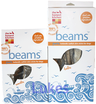 The Honest Kitchen BeamsPure Icelandic Catfish SkinsJust one healthy, pristine ingredient…..Beams are made from pure, wild-caught Atlantic Catfish* skins, from the clean ocean waters of Iceland, dried into savory, chewy sticks. They’re guaranteed to satisfy the pickiest of pups and are the perfect treat alternative to dried chicken snacks or bully sticks!(*Atlantic Catfish is a marine fish, which is different from domestic freshwater catfish found in the United States!)Beams are an excellent source of lean protein, they’re also lower fat and are a good source of Omega 3 Essential Fatty Acids. Fish is an excellent treat for dogs who have sensitivities to more common protein sources.Ingredients: Just one ingredient, wild-caught Atlantic Catfish skins, from IcelandGuaranteed Analysis:Protein, min 88%Fat, min 4%Fiber, max 0.2%Moisture, max 8%Omega 3 EFA, 1.5g /100gCalories (Calculated) 3650 cal/kgBeams Smalls are about 7 inches and have 26 calories per treat. Beams Talls are about 12 inches and have 39 calories per treat.