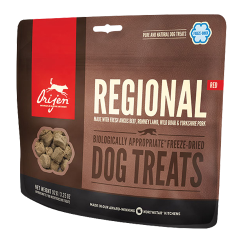 Orijen Regional Red Freeze Dried Dog TreatALL DOGS ARE EVOLVED AS CARNIVORES, BIOLOGICALLY ADAPTED TO THRIVE ON A VARIED DIET OF FRESH WHOLE MEATS. That's why ORIJEN treats are bursting with 100% pure and natural meats and nothing else — so you can indulge and nourish your dog at the same time.Made without cooking or preservatives, we gently freeze-dry our ORIJEN treats to lock in ALL of the natural goodness and amazing flavors of our fresh and regional ingredients in a reward your dog will love you for.Loaded with goodness and flavor, our unique red meats are ranch-raised under Alberta’s blue skies by people we know and trust, and then delivered to our kitchens fresh each day.Ingredients: Fresh beef liver (19%), fresh lamb liver (17%), fresh boar liver (14%), fresh pork liver (13%), fresh beef (13%), fresh pork (12%), fresh lamb (12%).Guaranteed Analysis: Crude Protein (min.) 45%Crude Fat (min.) 35%Crude Fiber (max.) 1%Moisture (max.) 5%Calorie Content: ME (calculated metabolizable energy) is 6 kcal/treatAvailable Sizes: 1.5 oz, 3.25 oz