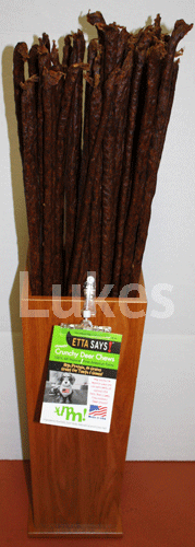 Etta Says Crunchy Deer Chews 3 FootEtta Says!® Crunchy Deer Chews are a unique mixture of rawhide and deer meat formed into a tasty chewable treat. The palatability of these chews ranks high with dogs as a highly sought after treat. They are safer than rawhide and made from wholesome American Deer! Our proprietary manufacturing process breaks the raw ingredients down to a powdery slurry and then extrudes them into a 3 foot crunchy chew! The result is a highly digestible chew that is great for teeth and gums. Guaranteed Analysis: Crude Protein Min 52%Crude Fat Min 20%Crude Fiber Max 4%Moisture Max 10%Ingredients: Rawhide, Deer Meat, Natural Caramel Color, Salt*If you order the 3 foot chews with other items we might have to cut the sticks in half to fit in a box. If you would like them to stay in original size please order this item on a separate order. Sorry for the inconvenience.
