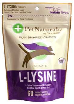Pet Naturals of Vermont L-Lysine Chews for CatsL-Lysine for Cats is a lysine supplement to support the ideal health of your cat.Super Cat deserves super health -- after all, that’s his namesake! L-Lysine Chews are tremendously tasty chews that support healthy tissue, respiratory and ocular health in felines. Maintaining these systems allows your cat to be happy and healthy on a daily basis, giving him plenty of time to worry about other things, like where he stashed that mouse toy.Ingredients: chicken liver flavor, starch, L-lysine, water, soy lecithin, canola oil, brewer’s yeast, glycerin, ground oat groats, ground malted barley, ground rye groats, oat meal,calcium sulfate, maltodextrin, sodium alginate, sorbic acid (a preservative), propionic acid(a preservative), mixed tocopherol blend (a preservative).Guaranteed Analysis per Chew (1.5 g):Moisture (max) 18.6 % L-Lysine 250 mg