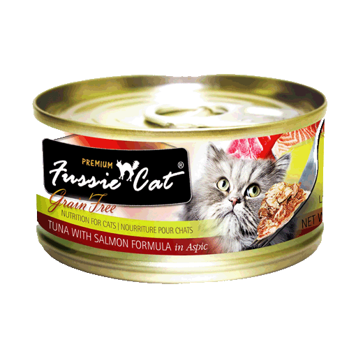 Fussie Cat Tuna with Salmon 2.82 ozIngredients: Tuna, Water Sufficient For Processing, Salmon, Sunflower Seed Oil, Tricalcium Phosphate, Locust Bean Gum, Carrageenan, Guar Gum, Potassium Chloride, Choline Chloride, Fructooligosaccharide, Taurine, Zinc Sulfate, Vitamin E Supplement, Ferrous Sulfate, Thiamine Mononitrate (Source of Vitamin B1), Nicotinic Acid (Source of Vitamin B3), Calcium Pantothenate, Vitamin A Supplement, Potassium Iodide, Manganese Sulfate, Copper Sulfate, Vitamin D3 Supplement, Riboflavin Supplement (Source of Vitamin B2), Pyridoxine Hydrochloride (Source of Vitamin B6), Folic Acid, Menadione Sodium Bisulfite Complex, Vitamin B12 Supplement.Guaranteed Analysis:-Crude Protein (min.) 12%-Crude Fat (min.) 1.4%-Crude Fiber (max.) 0.1%-Moisture (max.) 84.5%Calorie Content: 49 kcal/can