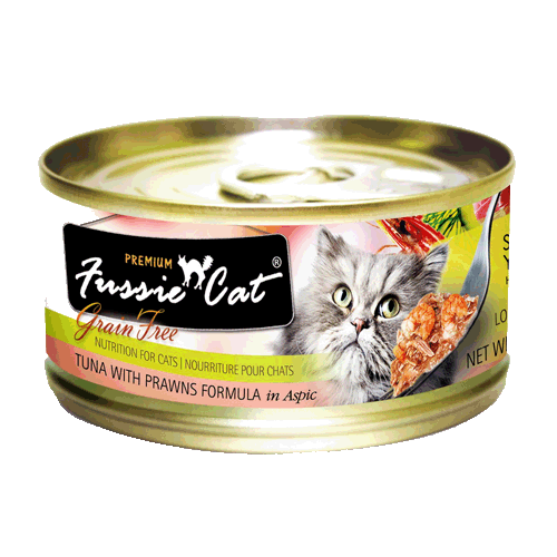 Fussie Cat Tuna with Prawn 2.82 ozIngredients: Tuna, Water Sufficient For Processing, Prawn, Sunflower Seed Oil, Tricalcium Phosphate, Locust Bean Gum, Carrageenan, Guar Gum, Potassium Chloride, Choline Chloride, Fructooligosaccharide, Taurine, Zinc Sulfate, Vitamin E Supplement, Ferrous Sulfate, Thiamine Mononitrate (Source of Vitamin B1), Nicotinic Acid (Source of Vitamin B3), Calcium Pantothenate, Vitamin A Supplement, Potassium Iodide, Manganese Sulfate, Copper Sulfate, Vitamin D3 Supplement, Riboflavin Supplement (Source of Vitamin B2), Pyridoxine Hydrochloride (Source of Vitamin B6), Folic Acid, Menadione Sodium Bisulfite Complex, Vitamin B12 Supplement.Guaranteed Analysis:-Crude Protein (min.) 12%-Crude Fat (min.) 1.4%-Crude Fiber (max.) 0.1%-Moisture (max.) 84.5%Calorie Content: 49 kcal/can