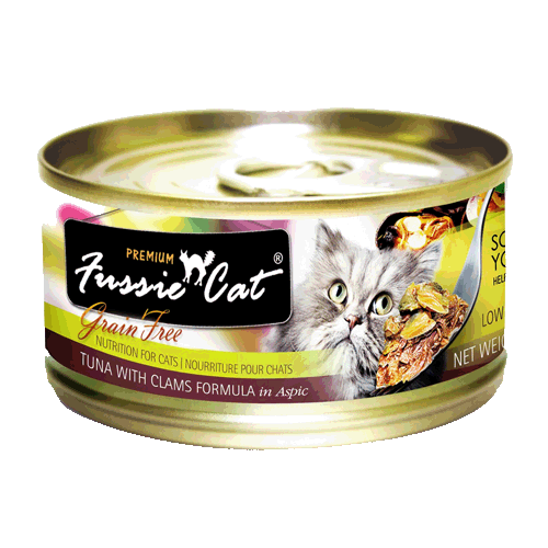 Fussie Cat Tuna with Clams 2.82 ozIngredients: Tuna, Water Sufficient For Processing, Clam, Sunflower Seed Oil, Tricalcium Phosphate, Locust Bean Gum, Carrageenan, Guar Gum, Potassium Chloride, Choline Chloride, Fructooligosaccharide, Taurine, Zinc Sulfate, Vitamin E Supplement, Ferrous Sulfate, Thiamine Mononitrate (Source of Vitamin B1), Nicotinic Acid (Source of Vitamin B3), Calcium Pantothenate, Vitamin A Supplement, Potassium Iodide, Manganese Sulfate, Copper Sulfate, Vitamin D3 Supplement, Riboflavin Supplement (Source of Vitamin B2), Pyridoxine Hydrochloride (Source of Vitamin B6), Folic Acid, Menadione Sodium Bisulfite Complex, Vitamin B12 Supplement.Guaranteed Analysis:-Crude Protein (min.) 12.4%-Crude Fat (min.) 1.4%-Crude Fiber (max.) 0.1%-Moisture (max.) 84.5%Calorie Content: 49 kcal/can