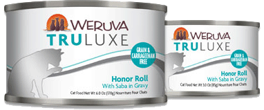 Weruva Truluxe Honor Roll Canned Cat FoodWhen your cats are on a roll, it's time for Honor Roll! Featuring Saba, a choice mackerel you often find in sushi rolls. It is our honor to provide you a new flavorful option in gravy for your kitty that is derived from sustainably sourced Saba and Saba alone! Get high marks with your cats today!Ingredients: Fish Broth, Saba*, Sunflower Seed Oil, Tricalcium Phosphate, Xanthan Gum, Calcium Lactate, Guar Gum, Fish Oil, Choline Chloride, Taurine, Zinc Sulfate, Vitamin E Supplement, Ferrous Sulfate, Thiamine Mononitrate (Vitamin B1), Nicotinic Acid (Vitamin B3 supplement), Calcium Pantothenate, Vitamin A Supplement, Potassium Iodide, Manganese Sulfate, Copper Sulfate, Riboflavin Supplement (Vitamin B2), Pyridoxine Hydrochloride (Vitamin B6), Folic Acid, Menadione Sodium Bisulfite Complex (Source of vitamin K), Vitamin D3 Supplement, Vitamin B12.