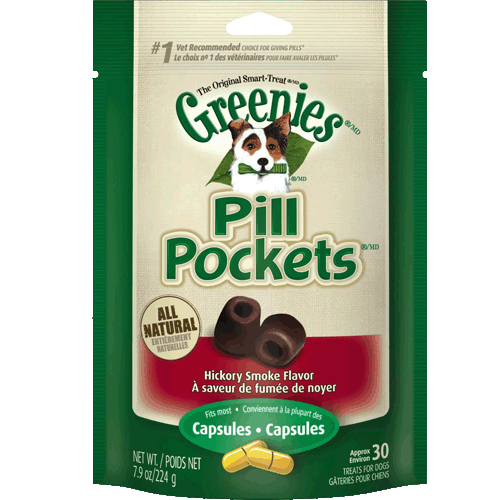 Greenies Pill Pockets Capsules for DogsWhy Greenies Pill Pockets Treats?Getting your pet to take a pill or medication can be diffcult and can leave you feeling frustrated and your pet angry, scared or confused.Greenies Pill Pockets Treats - Offer a proven solution to your pill-giving problem- Contain a built-in pouch suited for hiding a pill- Make taking pills a positive experience for your petIngredients: Rehydrated Chicken, Glycerin, Wheat Flour, Vegetable Oil, Wheat Gluten, Dried Corn Syrup, Dried Cultured Skim Milk, Natural Flavors, Caramel Color, Natural Hickory Smoke Flavor, Sodium Bisulfate, Xanthan Gum, Preserved with Mixed TocopherolsGuaranteed Analysis: Crude Protein (min.) 11%, Crude Fat (min.) 10%, Crude Fiber (max.) 1%, Moisture (max.) 31%