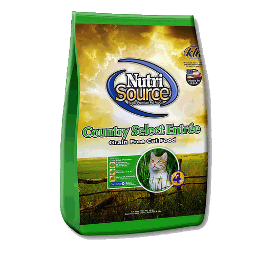 Nutrisource Country Select Dry Cat FoodNutriSource® Grain Free Cat Food - Country Select Entrée provides everything your cat needs in an all natural formula suitable for growing kittens and adult cats. It has great tasting chicken, salmon & liver that cats love. Formulated with premium all natural ingredients and the latest scientific feline nutritional information available, NutriSource® Cat & Kitten food provides complete care for kittens and adult cats.Ingredients: Chicken, Duck Meal, Peas, Chicken Meal, Chickpeas, Pea Protein, Chicken Fat (preserved with Mixed Tocopherols and Citric Acid), flax seeds, Dried Egg Product, Pea Fiber, natural flavor, Turkey meal, Tomato Pomace, Yeast Extract, Alfalfa Meal, Calcium Carbonate, Dried Brewers Yeast, Potassium Chloride, Phosphoric Acid, Minerals (Zinc Proteinate, Iron Proteinate, Copper Proteinate, Manganese Proteinate, Cobalt Proteinate), DL Methionine, Taurine, Cranberries, Choline Chloride, Chicory Root Extract, Vitamins (Vitamin A Acetate, Vitamin D3 Supplement, Vitamin E Supplement, Niacin, d-Calcium Pantothenate, Thiamine Mononitrate, Riboflavin Supplement, Pyridoxine Hydrochloride, Folic Acid, Biotin, Vitamin B12 Supplement), lactic acid, Inositol, Ascorbic Acid (source of vitamin C), Yucca Schidigera Extract, Calcium Iodate, Sodium Selenite, L-Carnitine, Rosemary Extract, Yeast Culture (Saccharomyces cerevisiae), Dried lactobacillus Acidophilus Fermentation Product, Dried Enterococcus Faecium Fermentation Product, Dried Aspergillus Niger Fermentation Extract, Dried Trichoderma Longibrachiatum Fermentation Extract, Dried Bacillus Subtilis Fermentation Extract.Guaranteed Analysis: Crude Protein (min.) 36%, Crude Fat (min.) 16%, Crude Fiber (max.) 7%, Moisture (max.) 10%Calorie Content:3840 kcal/kg446 kcal/cup Available Sizes:2.2 lbs*, 6.6 lbs, 16 lbs**available upon request